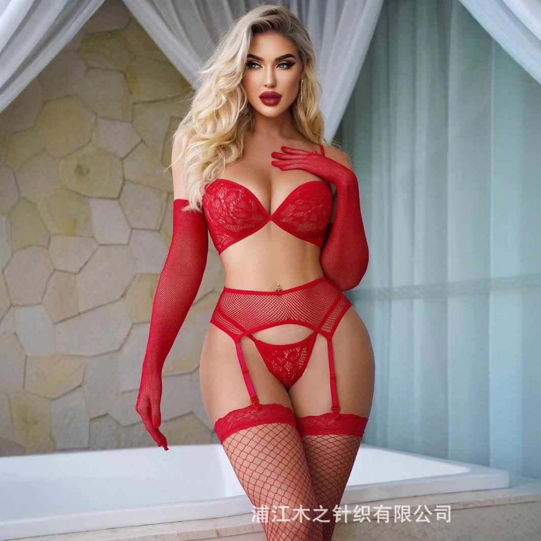 Exotic Hollow Popular Mesh Fishnet 5-Piece Set Exotic Lace Dance Costume with Gloves Stockings